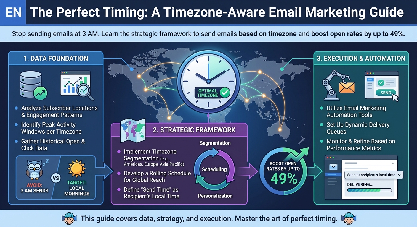 Przestań wysyłać e-maile o 3 w nocy. Poznaj strategiczne ramy wysyłki e-maili na podstawie strefy czasowej i zwiększ wskaźniki otwarć nawet o 49%. Ten przewodnik omawia dane, strategię i wykonanie.